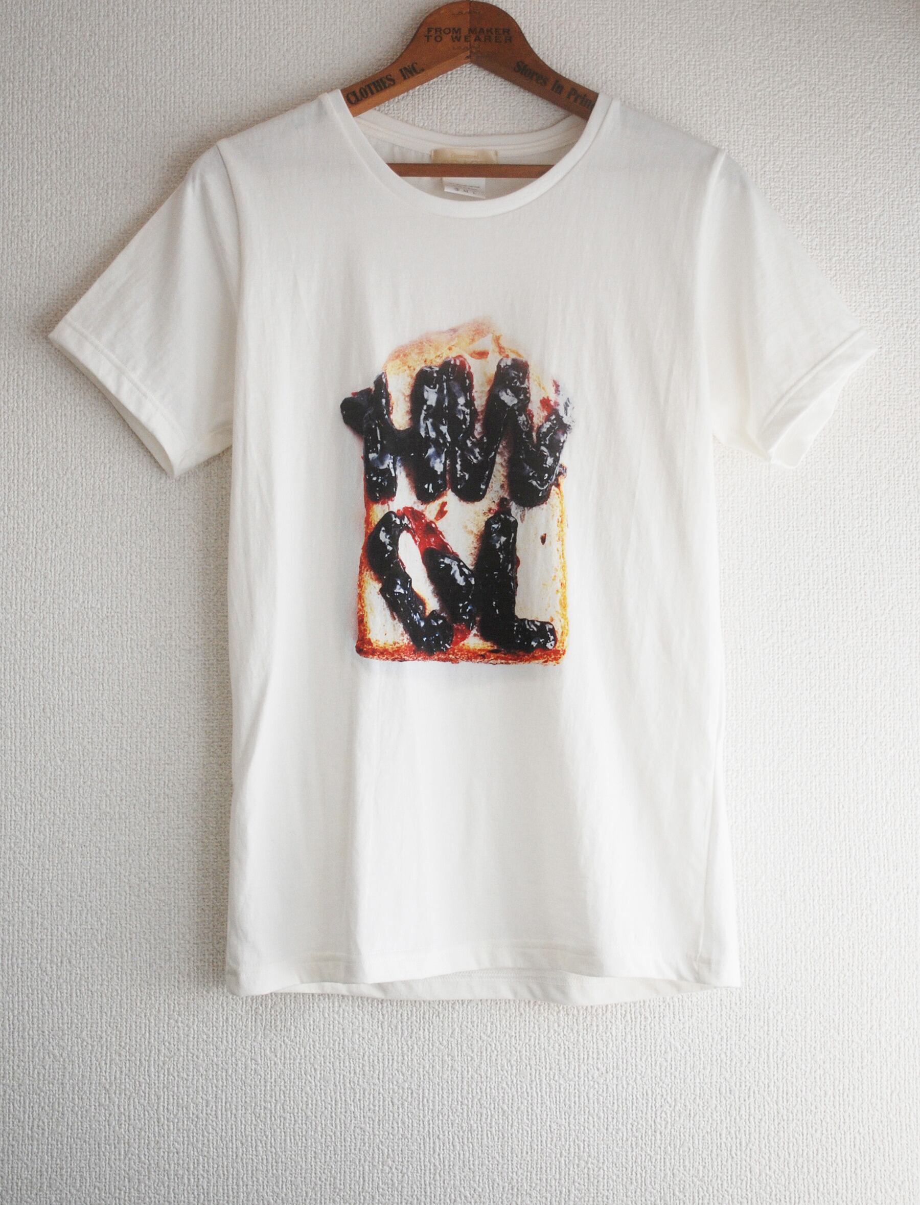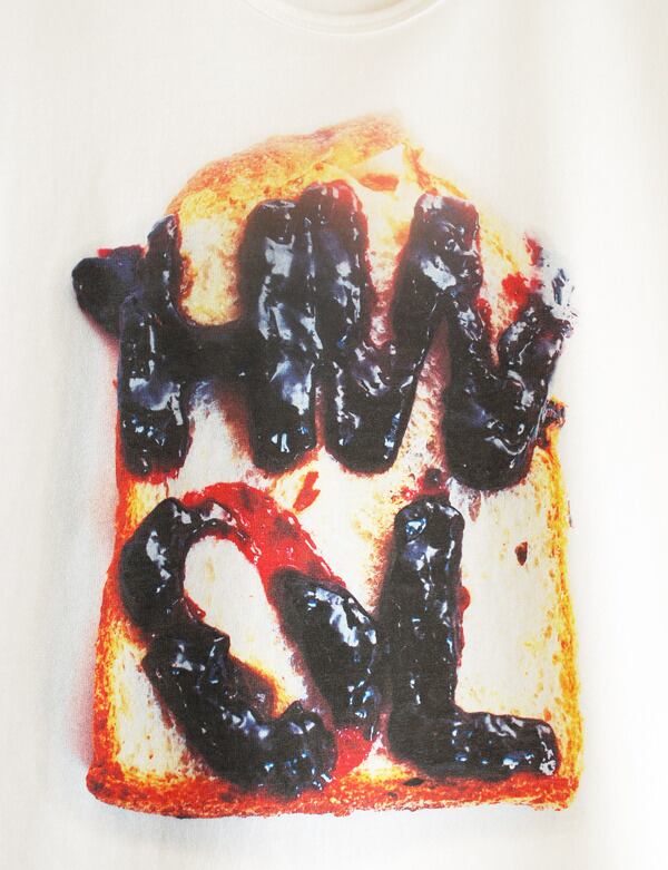 パンの上にジャムで書かれたメッセージのグラフィックが印象的な、クルーネックのTシャツになります。