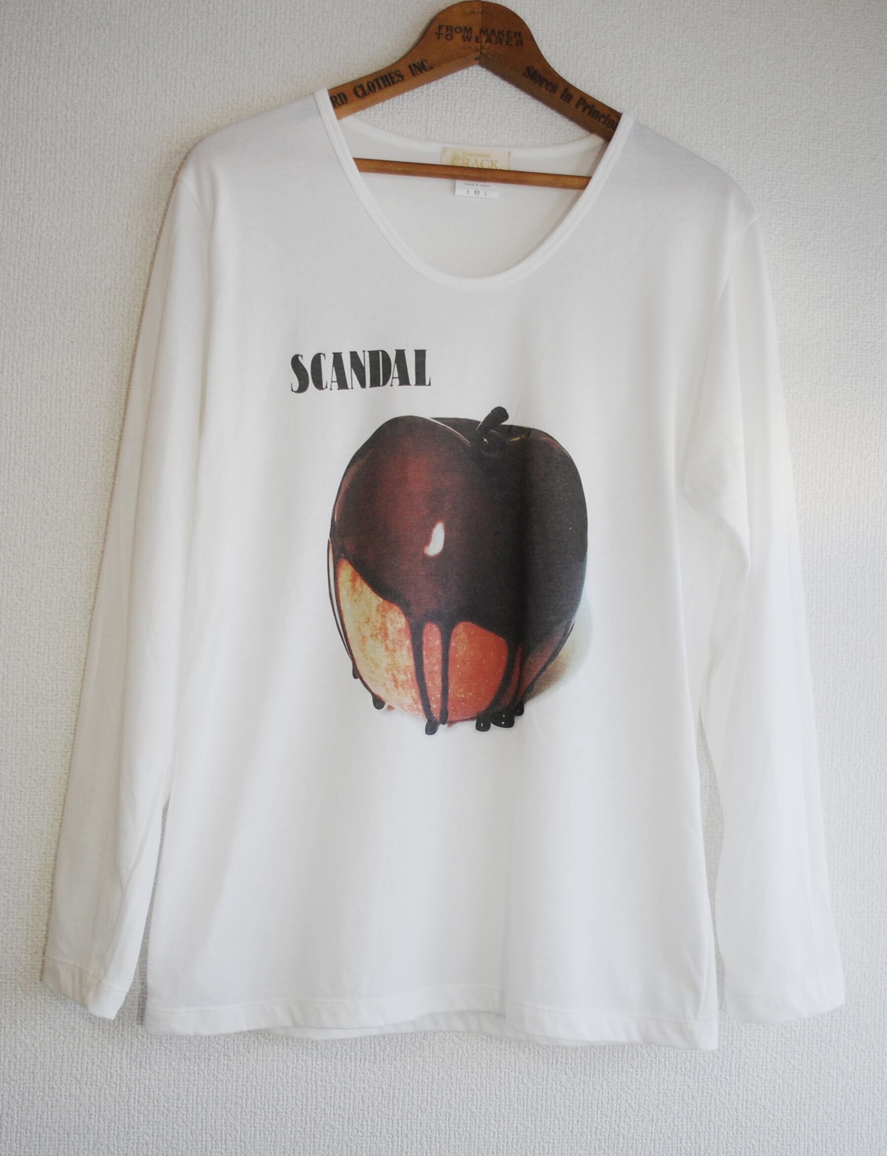 チョコレートソースが垂らされたアップルのグラフィックが印象的な、UネックのロングTシャツ。