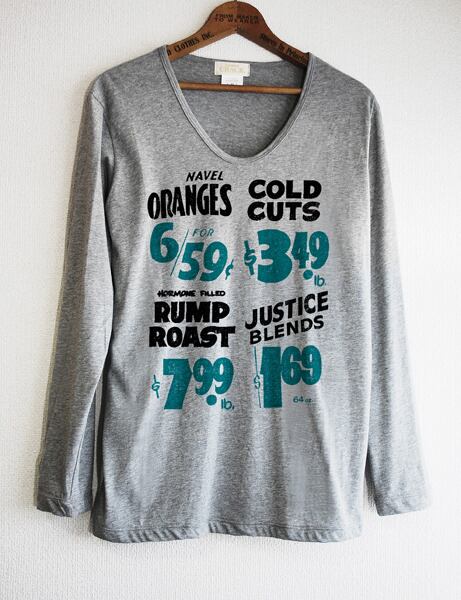 メッセージ性の高いポップなグラフィックが印象的な、UネックのロングTシャツ。